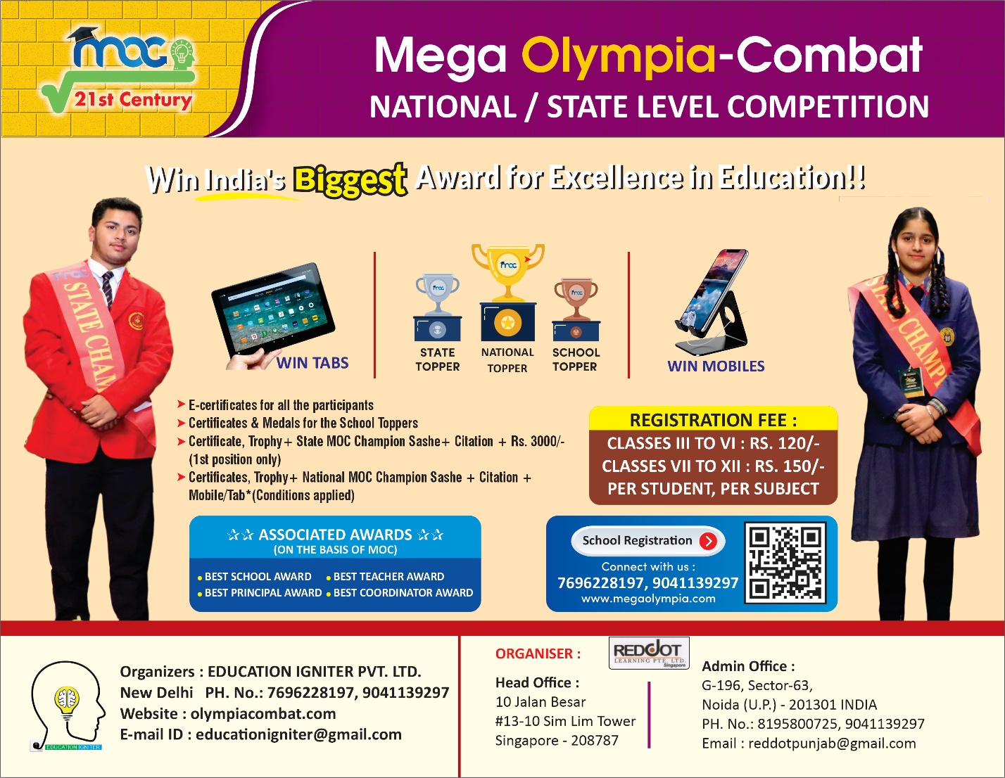 One of the world's premier academic leader EDUCATION IGNITER - Mega Olympia-Combat (MOC) has driven new ways of excelling in academics. It is founded and managed by leading academicians of the world with an aim of making students ready to face any challenge in life. Over recent years there has been a shift in the focus of educational measurement towards diagnostic assessment and a 'growth mind-set'. With a comprehensive reporting program and diagnostic feedback, the EDUCATION IGNITER assists the educators in establishing milestones that the students have reached in their learning domains, in setting personal targets for further learning and in monitoring the progress that they make over time. Assessments of progress are a welcome alternative to judge success only in terms of year-level standards. Importantly, the adoption of a growth 'mind-set' sets high expectations of every learner, including gifted students who sometimes are not challenged or stretched at school.