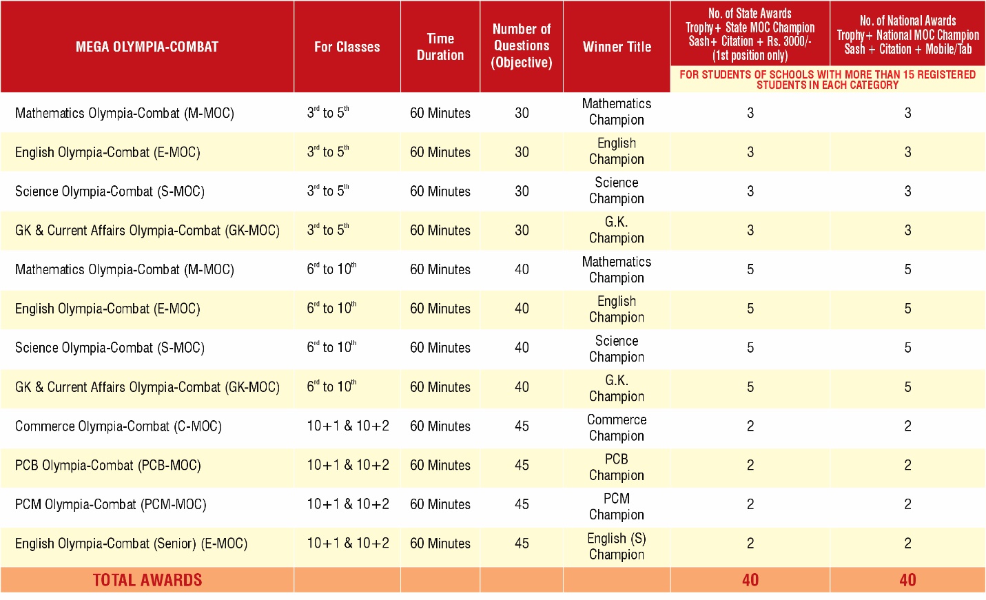 The Mega Olympia-Combat tests are skill based. They are aligned to but do not follow any single national curriculum. This allows students from all countries to be compared fairly. The duration of each test for the students of grade III -XII is 60 minutes. There are multiple-choice questions on each test.